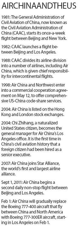 In 2012, Air China will gradually replace the Boeing 777-400 aircraft that fly between China and North America with Boeing 777-300ER aircraft. The first aircraft should debut in Los Angeles on Feb 1. The new twin-engine aircraft will save the company about 40 percent in operation costs - it burns four tons less fuel per hour than the current four-engine aircraft.