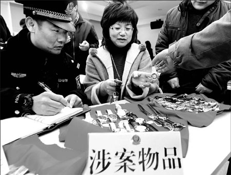 | Wei Jin (center), a Shanghai resident, collects her stolen belongings that were retrieved by police in Shanghai public security bureau's Changning branch on Jan 10. Chen Fei / Xinhua |