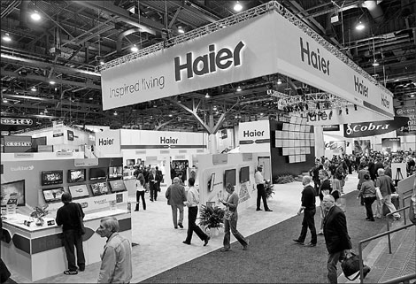 | A Haier Group booth at the Las Vegas International Consumer Electronics Show in January. Many Chinese consumer electronics companies, including Haier, Huawei Technologies Co Ltd and Lenovo Group Ltd, have established brand recognition in the United States. Yang Leishe / Xinhua |