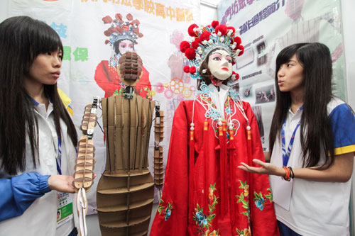 Two youngsters from Macao show off their robot, Cantonese opera ambassador, at the 12th Chinese teenagers' robot competition, in Tianjin on July 18. The robot was made of "green" materials. The competition attracted more than 500 entries. Li Xiang / Xinhua