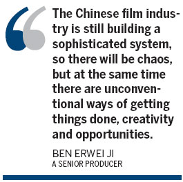 "The Chinese film industry is still building a sophisticated system, so there will be chaos, but at the same time there are unconventional ways of getting things done, creativity and opportunities," says Ben Erwei Ji, managing director of RG Communications and a senior producer who has worked at both major Hollywood and Chinese studios.