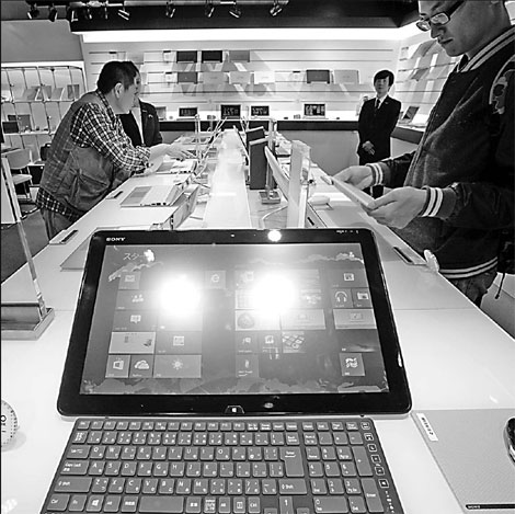 | Customers examining notebooks at a Sony store in Tokyo. Many Japanese electronics companies have cut or are going to cut their payrolls because their businesses are in the red. Provided to China Daily |