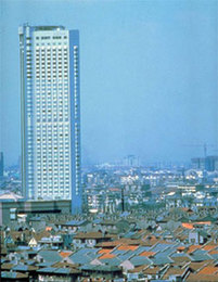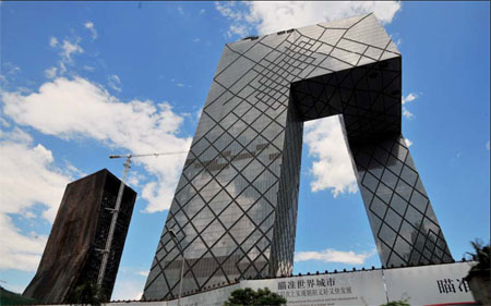 | Above: The architecture of CCTV headquarters is a distinctive feature in Beijing's skyline. Left: The 42-floor Jing'an Hilton Hotel, built by Arup, dominated the Shanghai skyline in the early 1980s. Provided to China Daily |