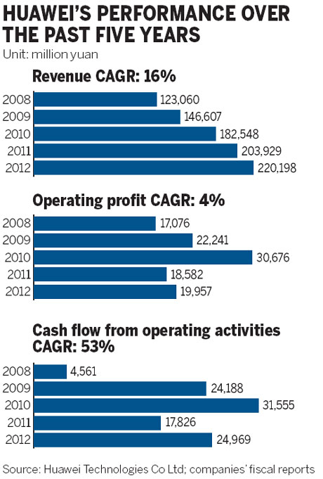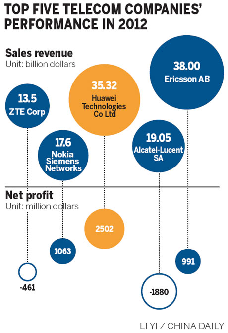 Huawei is not far behind the No 1 vendor Ericsson. Huawei's revenue rose 8 percent to 220 billion yuan last year. Its net profit increased to 15.38 billion yuan during the period, up from 11.65 billion yuan a year earlier. Ericsson booked about $38 billion in revenue in 2012.