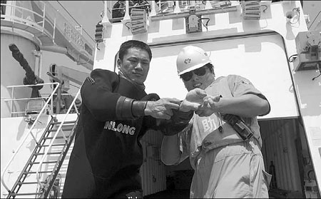 | Diver Tang Shunjie (left) wears diving gear on Donghai rescue vessel No 110 in July. Gao Erqiang / China Daily |