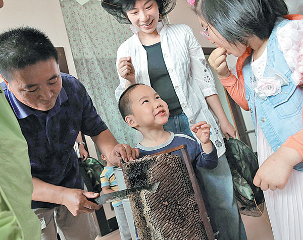 | Visitors have a taste of fresh honey at Song Xuezhou's bee farm. |