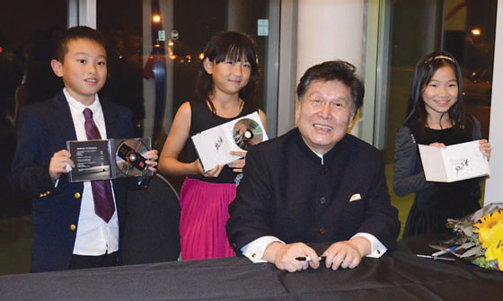 | Yin Chengzong is flanked by three younger admirers, from left Peter Qiu, Alyssa Wang, and Alena Lu, all currently practicing piano. Cai Chunying / China Daily |