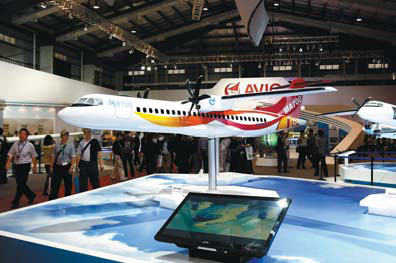 | A model of the next-generation turboprop MA-700 regional airliner is on display at an air show in 2010. Aviation Industry Corp of China, a major Chinese aircraft manufacturer, said on Thursday it will complete the design of the 78-seat airliner next year. Its maiden flight is slated for 2016. Yang Jia / for China Daily |