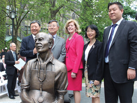 | SCULPTURE UNVEILED Guests pose after the unveiling of the sculpture of Dr. Norman Bethune on May 30 at the University of Toronto (U of T). From left: Niu Gensheng, vice-president of the China Charity Alliance and president of Laoniu Foundation; Zhang Lanchun, ministercounselor (Education Affairs) at the Chinese embassy in Canada; Catharine Whiteside, dean of the faculty of Medicine, U of T; Wu Dongmei, Chinese deputy consul general in Toronto; and Zhang Bin, president of the China Cultural Industry Association and chairman of the Millennium Golden Eagle International. |