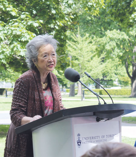 | HONORING A GREAT Adrienne Clarkson, 26th governor general of Canada and the author of Extraordinary Canadians: Norman Bethune, speaks at the unveiling of the Bethune sculpture on May 30. She noted that he was a person who wanted to help, who wanted to heal and who did things out of selfl essness. Photos by Na Li / China Daily |