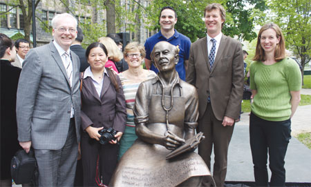 | FAMILY GROUPING Members of the Bethune family gather at the bronze sculpture of Dr Bethune, an alumnus of the University of Toronto's faculty of Medicine. The sculpture was unveiled at the institution's St George campus on the 75th anniversary of Bethune's death on May 30. |