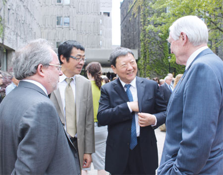 | THE PHILANTHROPIST Niu Gensheng (second from right), vice-president of the China Charity Alliance and president of the Laoniu Foundation, talks with Michael Wilson (right), chancellor of the University of Toronto, at the unveiling of the Bethune sculpture on May 30. |