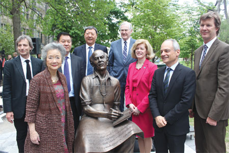 | DISTINGUISHED GUESTS Guests pose at the Bethune statue on May 30. From left: David Pellettier, sculptor who created the sculpture; Adrienne Clarkson, former governor general of Canada; Zhang Bin and Niu Gensheng, the sculpture's fi nancial donors; Michael Wilson, chancellor of the University of Toronto; Catharine Whiteside, dean of the faculty of Medicine; Meric Gertler, president of the University of Toronto; and David Price, a member of the Bethune family. Zhang Bin and Niu Gensheng contributed $800,000 to commission the life-sized work and for new scholarships for medical students in Bethune's name. |