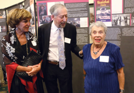 | Evelyn Pike Rubin (right) and Jerry Lindenstraus (center), who both fled Nazi Germany for Shanghai in 1939 with their families, attend a reception on Monday in Washington for the weeklong Jewish Refugees and Shanghai exhibit at the Walter E. Washington Convention Center. On the left is Lindenstraus' wife, Marjeri Hadar. PHOTO BY CHEN WEIHUA / CHINA DAILY |