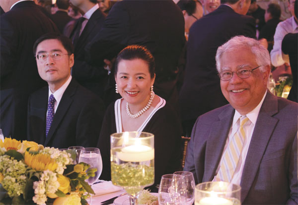 | New York: Doing launch From left: Cheng Lei, deputy consulate general of the Chinese Consulate General in New York; Qiao Li, consul in New York, and Cesar A. Perales, New York secretary of state, attend the China Southern Airlines Gala Dinner in New York on Wednesday. Hu Haidan / China Daily |