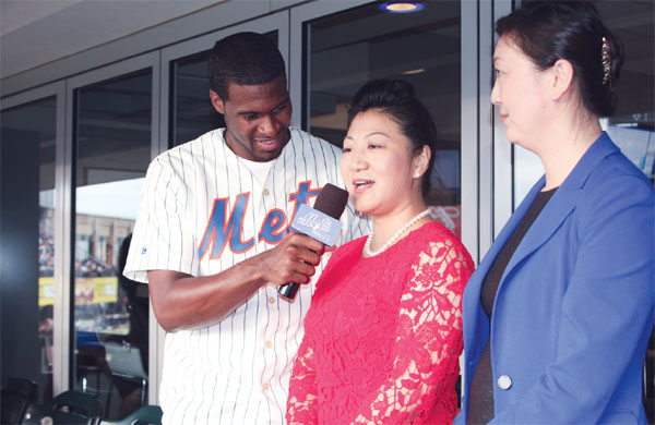 | Queens, New York: Home run Zhang Meifang (center), deputy consul general of the Chinese Consulate General in New York, speaks with a representative of the New York Mets during a game between the Mets and the San Francisco Giants at Citi Field in Flushing, Queens on Aug 2. Zhang and Li Li (right), president of the Sino-American Cultural and Arts Foundation (SACAF), joined a number of community leaders for the Mets' sixth installment of An Evening with Chinese Culture. Jack Freifelder / China Daily |