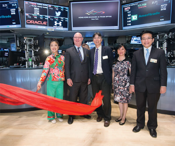 | New York: Enter the dragons Steve Barclay (second from left), director of the Hong Kong Economic and Trade Office in New York, is joined by Henry Wan (center), chairman of the Hong Kong Dragon Boat Festival in New York, and other guests, for a group photo at the NYSE on Aug 6, where they rang the opening bell to highlight the 24th Annual Hong Kong Dragon Boat Festival at Flushing Meadows Corona Park, NY on Aug 9-10. Provided to China Daily |