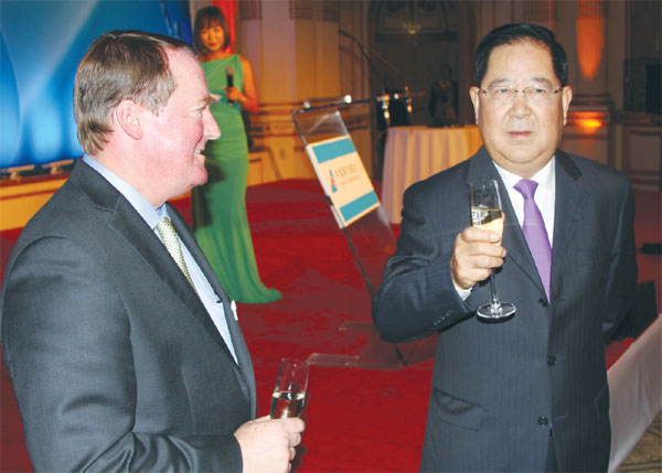 | New York: Raise a glass Jeff Hofgard (left), vice-president of International Operations and Policy for Boeing Government Operations, and Si Xianmin, chairman of China Southern Airlines Co Ltd, toast the launch of the airline's new direct service between Guangzhou and New York at the Plaza Hotel in New York on Wednesday night. Jack Freifelder / China Daily |
