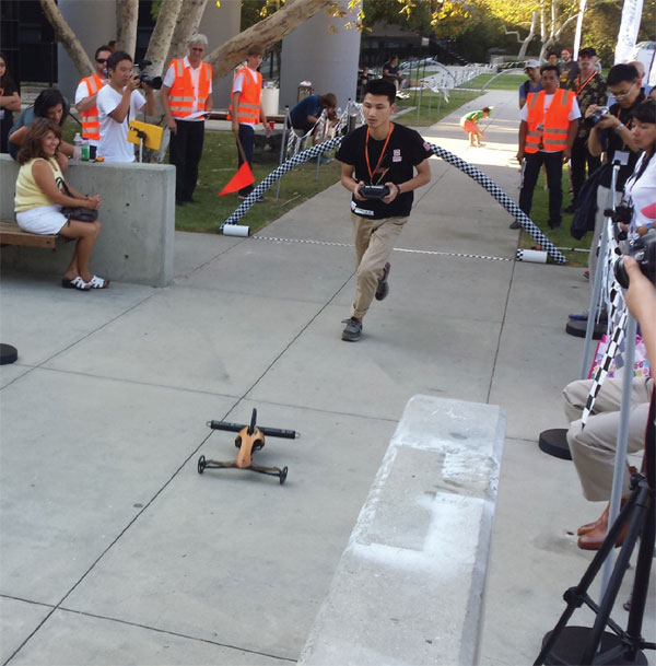 | Pasadena, CA: Need for speed Super DNA, a team from the China Academy of Art, makes it into the final round of the 2014 Formula E Race at the Art Center College of Design in Pasadena, California on Thursday. Cindy Liu / China Daily |