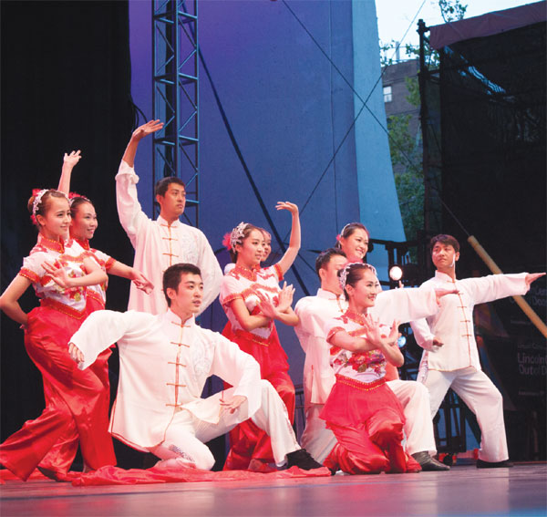 | New York: Open air Dancers from the Chinese American Arts Council perform the traditional Chinese dance From Chinatown with Love as part of the Lincoln Center Out of Doors in New York on Thursday. Li Ang / For China Daily |