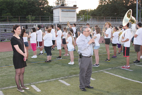 | Staten Island, New York: Taking the field David LaMorte (speaking into microphone), assistant principal of visual performing and career arts and director of the Tottenville High School Marching Band, welcomes Chinese exchange students with Li Li (left), president of the Sino-American Culture and Arts Foundation (SACAF) during an event on Monday at Tottenville High School in Staten Island, New York. Close to 200 Chinese and US high school students met on Monday as part of a week-long exchange program designed to deepen friendships between teens from the US and China. Jack Freifelder / China Daily |