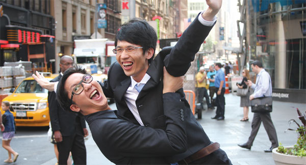 | New York: Ready to soar Jeff Lyndon (left), president and co-founder of iDreamSky Technology Ltd, poses for a photo with CEO and co-founder Michael Chen on Thursday in front of the Nasdaq Stock Exchange in New York. A number of company representatives, as well as family and invited guests, were on hand in New York to witness the company's $115.5 million initial public offering. Jack Freifelder / China Daily |