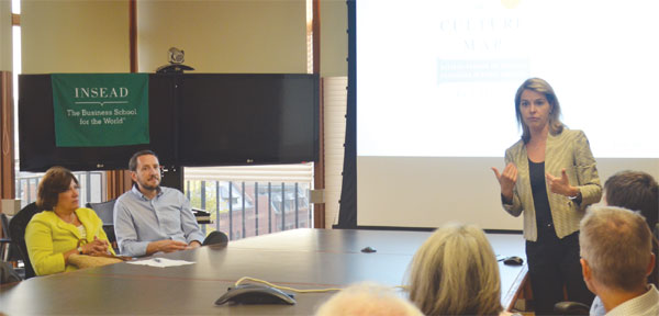 | Washington: Culture coping Erin Meyer (center), affiliate professor in the Organizational Behavior Department at INSEAD (European Institute of Business Administration), discusses on Monday insights from her new book, The Culture Map, which explores how cultural differences impact international business, at Johns Hopkins School of Advanced International Studies. Liu Chang / China Daily |