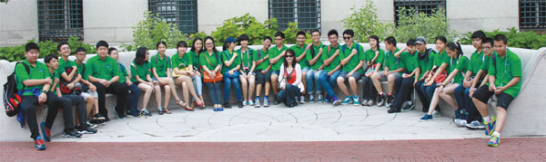 | New York: Camping outbound W Academy summer camp students visit New York's Columbia University with Danielle Accettola (center, first row), president of WL Global Corp., and Sirun Chen (11th from left), client relations coordinator of WL on Aug 2. W Academy, a division of WL, hosts summer camps for Chinese students who come to the US to experience academic and cultural explorations during program. Provided to China Daily |