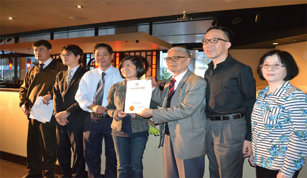 | Yip Wai-Hong (center), together with main orchestra member and VIP guests of the welcome reception hosted on July 28, holds the Certificate of the "Day of Hong Kong Children's Symphony Orchestra" awarded by King County Executive Dow Constantine. Deng Yu / China Daily |