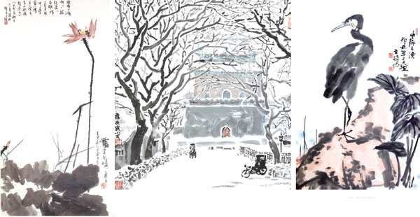 | Pink Lotus (left) by Pan Tianshou in 1963. Snow (middle) by Li Xiaoke, son of Li Keran, in 2010. Egret (right) by Li Kuchan in 1973. Below: The print edition of Pierre-Auguste Renoir's Dance at le Moulin de la Galette. Photos Provided to China Daily |