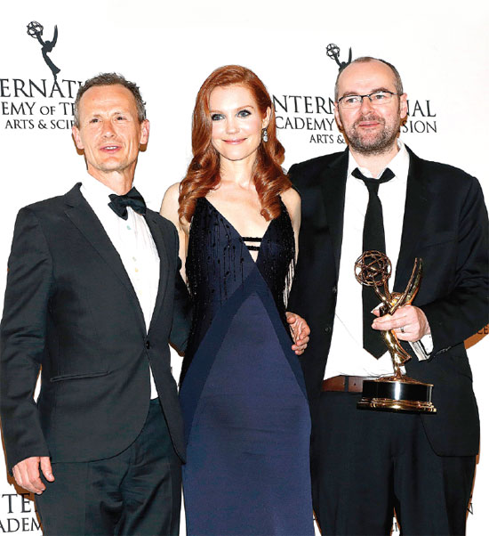 | Director Marc Munden (left) and executive producer Dennis Kelly of British crime series Utopia pose backstage with their award for drama series with actress Darby Stanchfield at the 42nd International Emmy Awards in New York on Monday. Reuters |