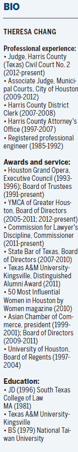 Then another opportunity came her way: In early 2012, a judgeship on Harris County Civil Court No. 2 became vacant before an election. Chang applied and was appointed to fill it by the Commissioners Court.