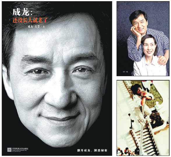 | Clockwise: Jackie Chan coauthors the autobiography, Jackie Chan: Grown Old Before Grown Up, with Zhu Mo (top right). A photo in the book shows one of the many deathdefying stunts Chan performed in his movies. In the book Chan shares personal stories in the friendly manner of a hearttoheart talk. Photos Provided To China Daily |
