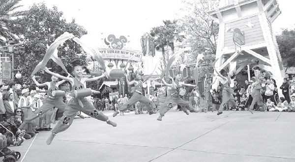 | A group of young performers entertain audiences with a waist-drum dance show at US Disneyland in February. Photos Provided to China Daily |