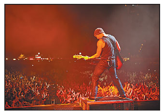 | Above: Linkin Parkmembers (fromleft to right) guitaristsongwriter Mike Shinoda, drummer Rob Bourdon, bassist Dave Farrell, leading vocalist Chester Bennington, guitarist Brad Delson and DJprogramer Joe Hahn. Below: Linkin Park performs at a concert of The Hunting Party Tour. Photos Provided To China Daily |