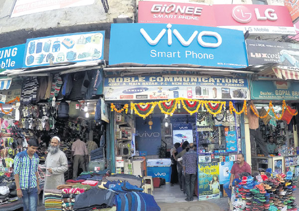 | Chinese smartphone logos of vivo and Gionee on advertising billboards above an electronics store in New Delhi, India.Provided To China Daily |