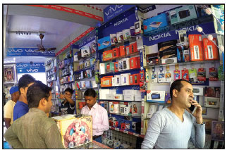"The business has been very good these days," said Kumar, standing behind a glass counter full of mobile phones made in China. His booth is sandwiched in a store selling knock-off Adidas bags and a shop vending 50-rupee ($0.75) slippers.