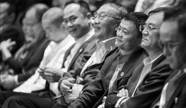 | Jack Ma (third from right), executive chairman of Alibaba Group Holding Ltd, seen among Chinese tech millionaires during the opening ceremony of an academic symposium in Hangzhou, Zhejiang province. Xu Kangping / For China Daily |