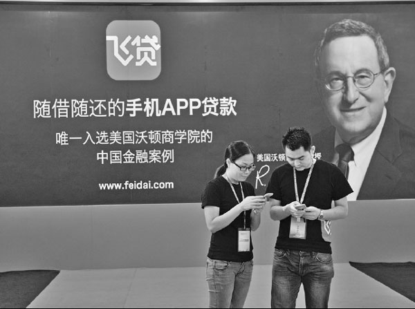 | Two people stand before a billboard advertising a mobile app designed for submitting applications for bank credit. The app was developed by Shenzhen-based ZTE Corp. Xiao Xiang / For China Daily |