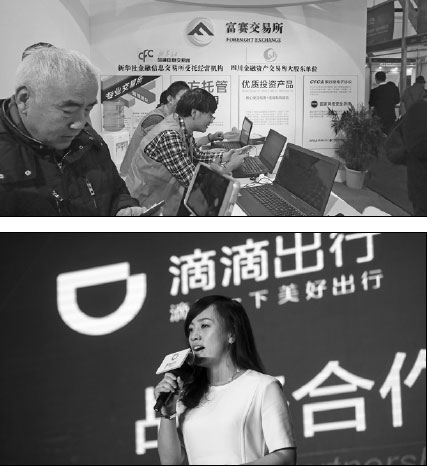 | (Above)People consult for information on startup financing and investment at the Foresight Exchange office in Beijing. Aqing / For China Daily (Below)Liu Qing, president of Didi Kuaidi company, announces Didi's cooperation with China Merchants Bank. Fred Dufour / For China Daily |