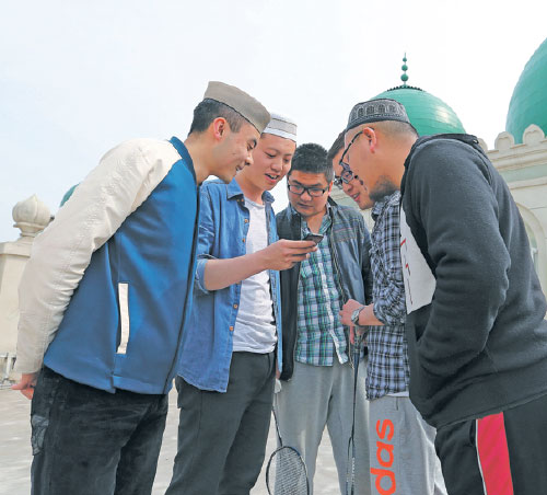 | Students at the institute, many of whom are expected to become religious leaders, read a message on a smartphone during a class break on April 12. Wang Zhuangfei / China Daily |