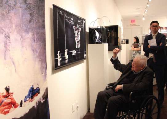 Ming Cho Lee (front) browses the exhibition of his work at the Museum of Chinese in America (MOCA) in New York with Herb Tam (right), MOCA's curator and director of exhibitions, on April 28. Niu Yue / For China Daily |
