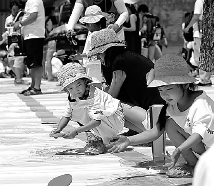 | Children paint an Arabian horse on a canvas of 1,200 square meters for the show Cavalia in Beijing. Feng Yongbin / China Daily |