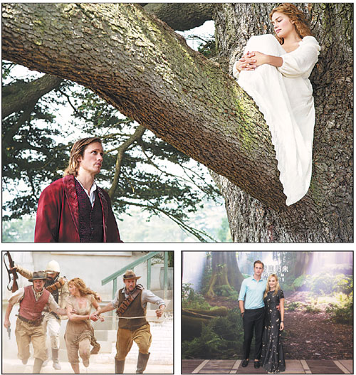 | Top and above left: Warner Brothers' upcoming blockbuster, The Legend of Tarzan, will open in Chinese mainland theaters on July 19. Above right: Alexander Skarsgard and Australian actress Margot Robbie meet Chinese fans in Beijing last week. Photos Provided To China Daily |