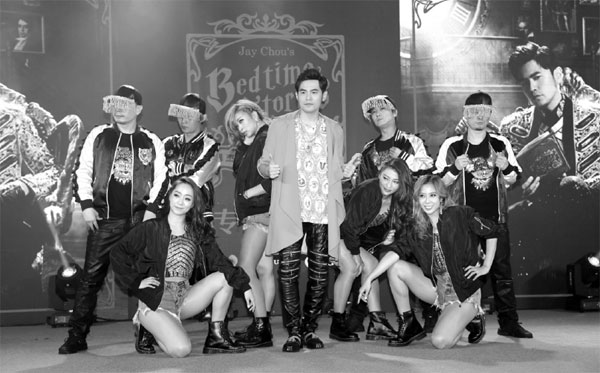 | Jay Chou (center) at a Beijing event to promote his latest Mandarin album, Jay Chou's Bedtime Stories. Photos Provided to China Daily |