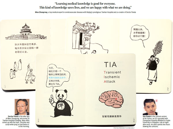 The cartoons are the idea of two doctors, Miao Zhongrong and He Yizhou: The two main characters are their alter egos. Miao, alias Dr Panda, is an expert in cerebrovascular diseases at Tiantan Hospital in Beijing, and He Yizhou, alias Sha Daidai, is an ICU specialist at Zhongshan Hospital in Shanghai, which is linked with the city's Fudan University.