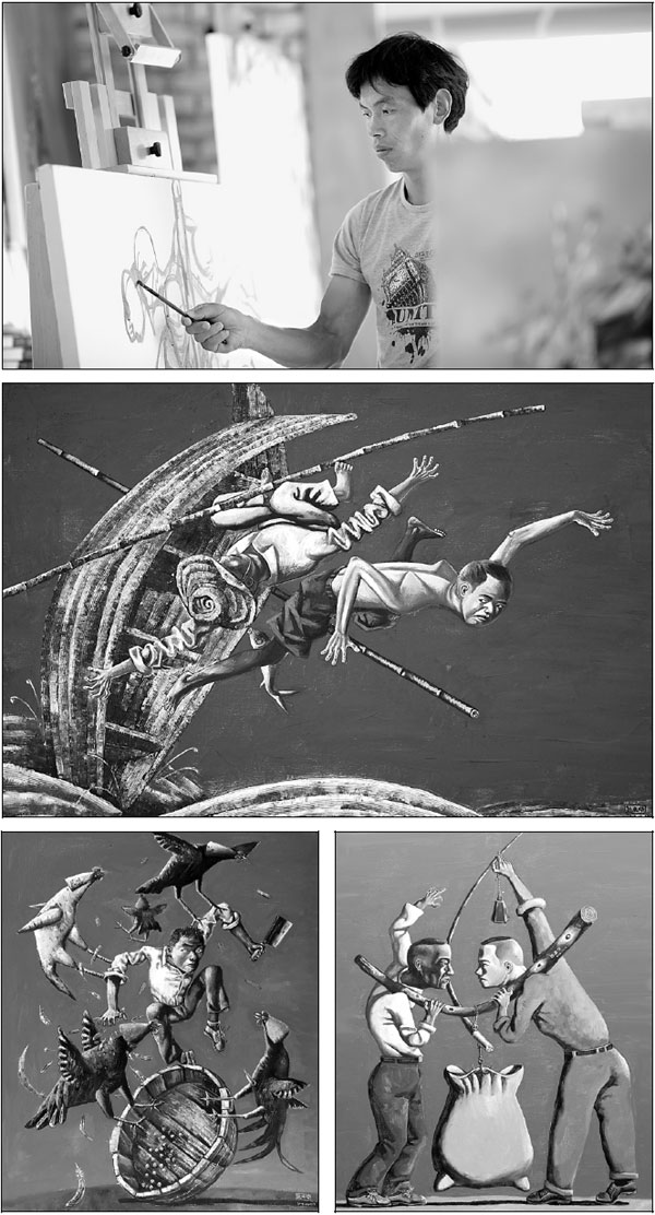 | Painter Xiong Qinghua creates in his Western-style home and studio in Changhe village, Hubei province, many surrealist images that reflect the serene past of the countryside and its current realities. Photos by The Artist |
