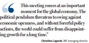 "This meeting comes at an important moment for the global economy. The political pendulum threatens to swing against economic openness, and without forceful policy actions, the world could suffer from disappointing growth for a long time," she said.