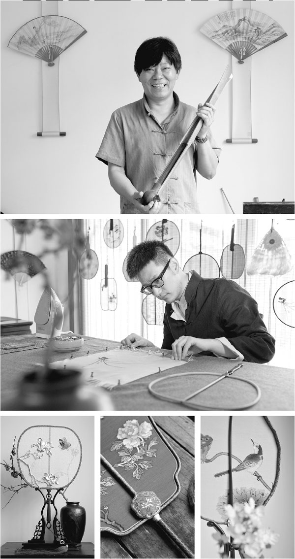 Wang Jian (top) and Li Jing have each earned acclaim for their work in crafting traditional fans. Fans that have good craftsmanship and intricate designs are highly sought after by collectors and can cost tens of thousands of yuan.Photos By Gao Erqiang / China Daily |