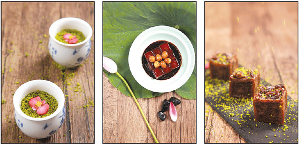 | From left: Cream pudding with Longjing tea sauce; pork braised in brown sauce; walnut cake. Photos Provided to China Daily |